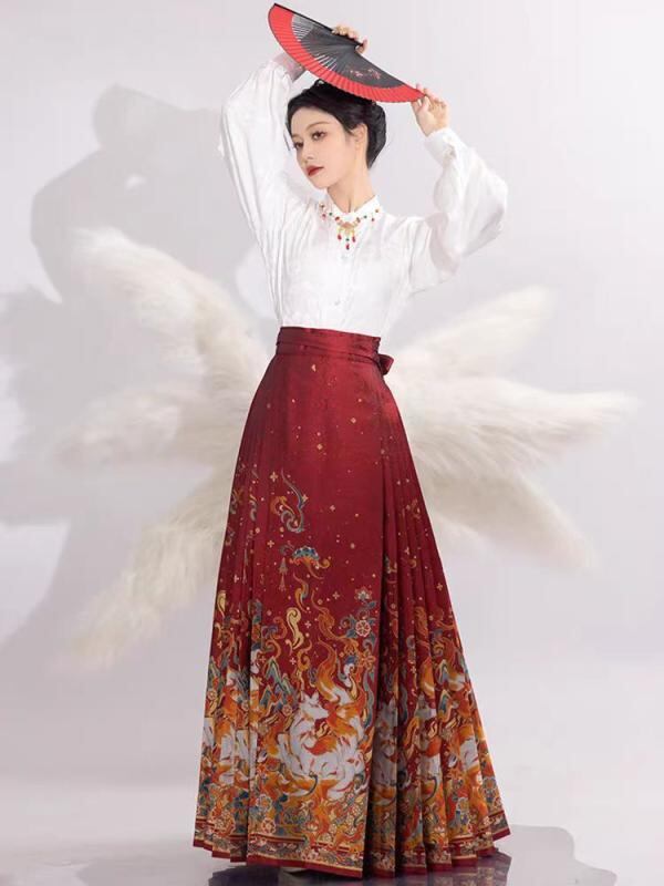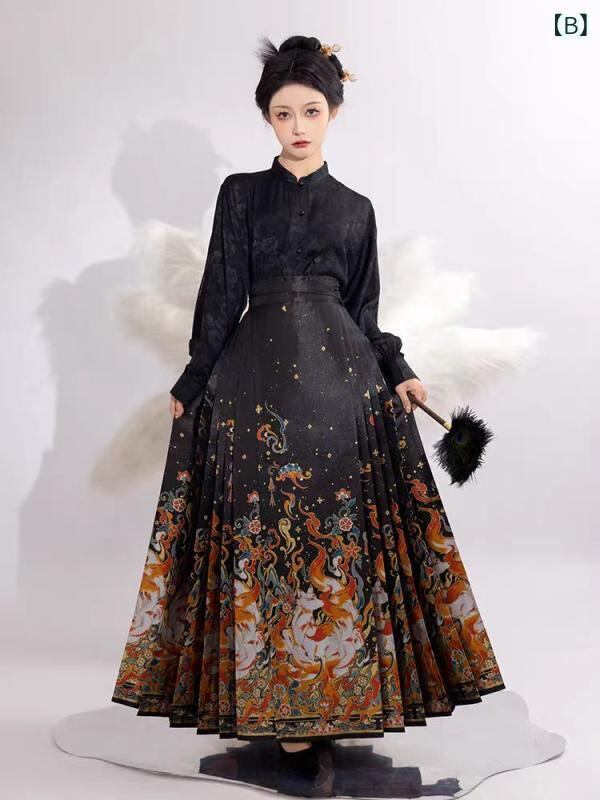 セットアップ レディース 馬面スカート 九尾の狐 高級感 中国風 日常使い セレモニー 結婚式 フォーマル コットン ポリエステル素材 刺繡デザイン レッド ブラック ブルー
