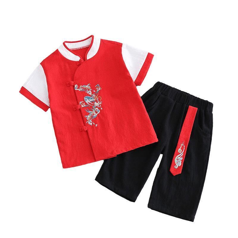 漢服 男の子 キッズ 男児 夏服 半袖 セットアップ 上下セット 古風 中国風 民族風 動物柄 綿 コットン 柔らかな肌触り レッド ブルー イベント 衣装 普段着
