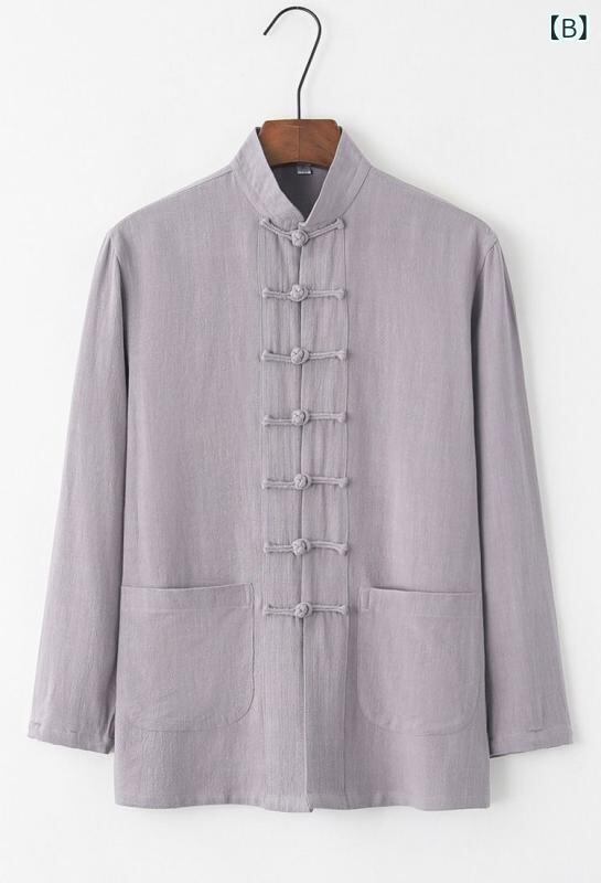 シャツ メンズ シニア向け 中華風 チャイナシャツ 唐装 長袖 綿麻 リネン 夏 普段着 部屋着 紺 グレー 白 ライトグリーン 麻色 黒