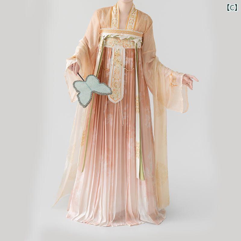 漢服 レディース 女性用 唐風 刺繍入り 対襟シャツ ブラウス 斉胸スカート ロングスカート セットアップ 古風 中国伝統衣装 デイリー 普段使い 春 秋 シフォン ポリエステル