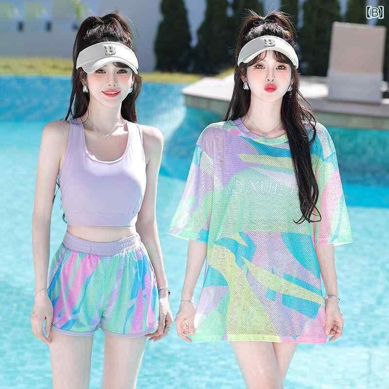 水着 レディース セパレート 3点セット 体型カバー ぽっちゃり 細見え 速乾素材 半袖トップス パッド入り ピンク パープル 温泉 プール 海水浴 大きいサイズ ポリエステル スイムウェア