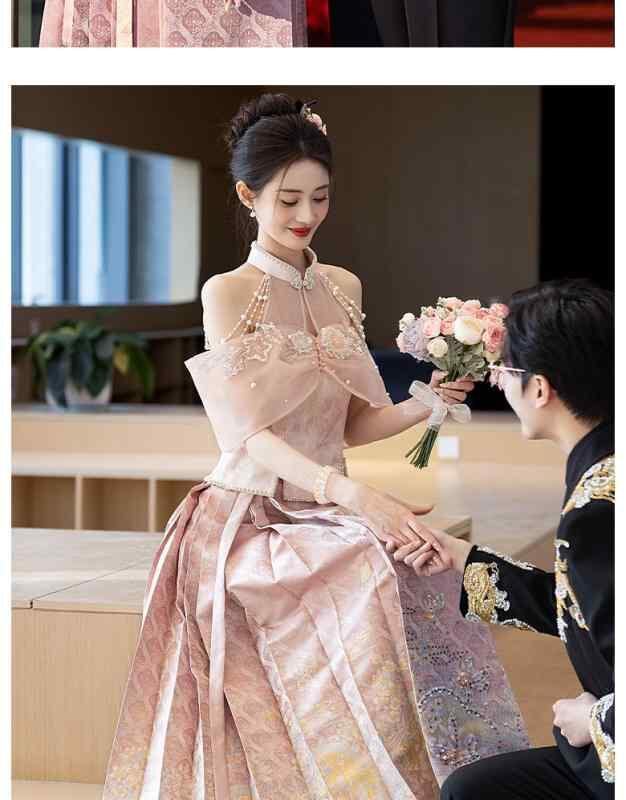 漢服 レディース 新チャイナ風 馬面スカート ドレス オフショルダー 結婚式 披露宴 二次会 フォーマル ウェディングドレス セットアップ エレガント 上品 ポリエステル アースカラー | cybercart