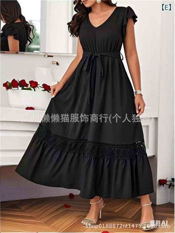 ワンピース レディース Vネック 半袖 ロング丈 マキシ丈 無地 レース切替 Aライン フレア ポリエステル カジュアル リラックスウェア プルオーバー ライトグリーン ブルー ブラック