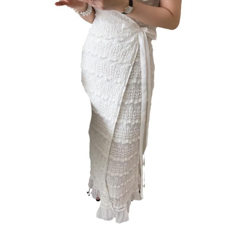 ワンピース レディース Vネック レース かぎ針編み フレアスリーブ 半袖 ハイウエスト ウエストマーク ロング丈 ストレートシルエット 無地 ドレス エレガント 上品 韓国ファッション カジュアル ホワイト ブラック