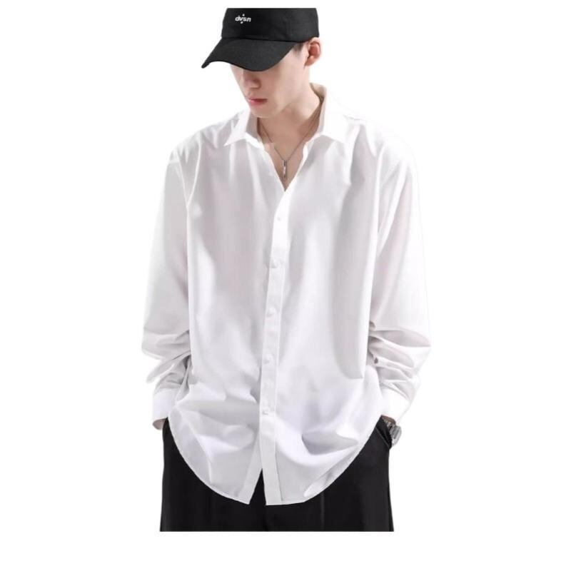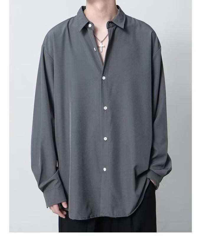 シャツ メンズ 男性 長袖 ルーズフィット ゆったり ドレープ感 接触冷感 免アイロン イージーケア シワ防止 ポリエステル 高級感 上品 スマート クール カジュアル ビジネス 普段使い 通勤 無地 ブラック ホワイト グレー