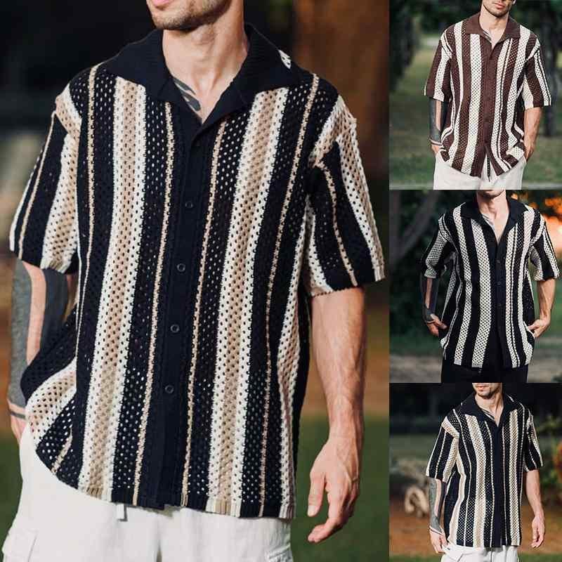 シャツ メンズ 半袖 カジュアル レトロ 襟付き ビッグシルエット ルーズフィット 綿混 ポリエステル 通気性 ニット切り替え ストライプ メッシュ柄