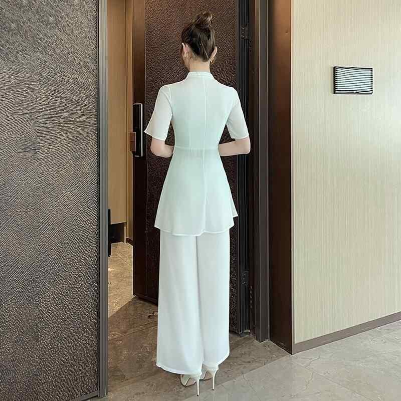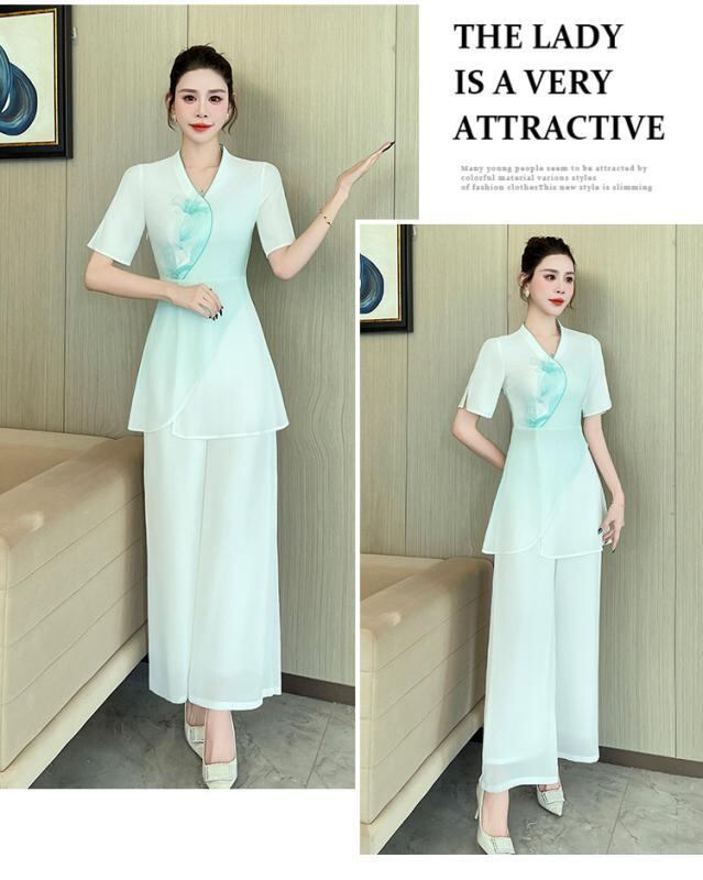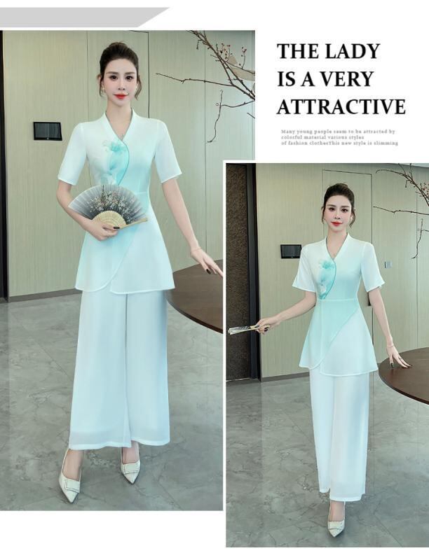 ユニフォーム レディース 美容院 エステ マッサージ スパ リラクゼーション 施術着 制服 チャイナ風 オリエンタルデザイン グラデーションカラー ポリエステル ポリウレタン メッシュ素材 伸縮性 軽量 吸湿速乾 上下セット