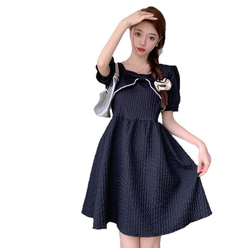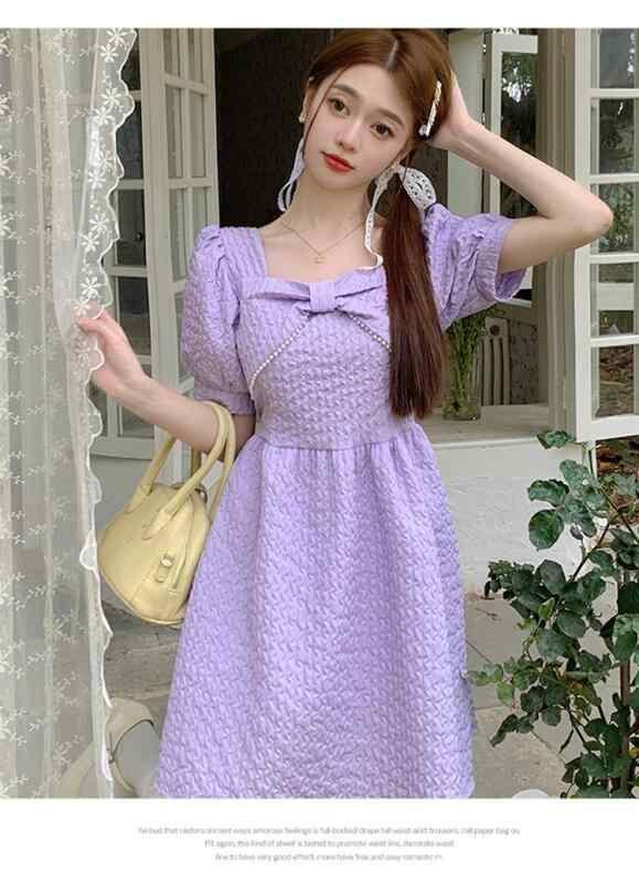 ワンピース レディース 夏 フレンチデザイン パールトリム リボン プリンセス ミディ丈 ショートスリーブ パフスリーブ スクエアネック ハイウエスト 韓国風 インスタ映え ポリエステル クリームホワイト パープル ブラック