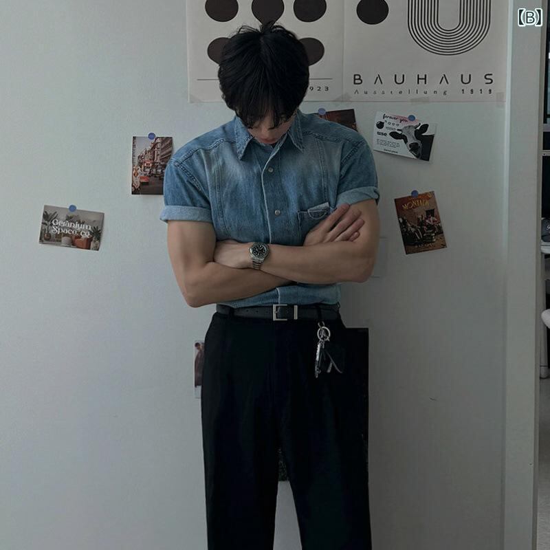 シャツ メンズ 半袖 レトロ ウォッシュ加工 綿混 カジュアル ゆったり 韓国風 個性的 通勤 オフィス 普段使い 休日スタイル ブラック ブルー