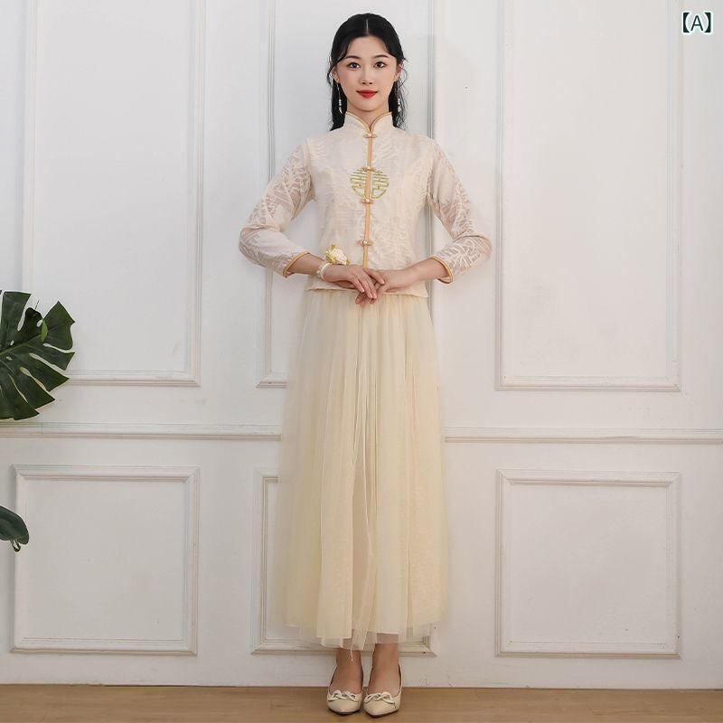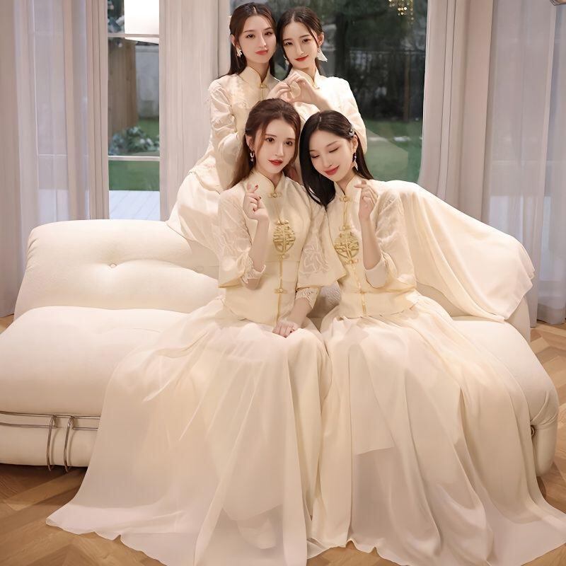 ドレス レディース ブライズメイド 中華風 秀禾スタイル シンプル エレガント 結婚式 お呼ばれ パーティードレス Aライン オフショルダー 長袖 ロング丈 パフスリーブ シャンパンカラー シェニール スパンデックス 立体模様 春秋