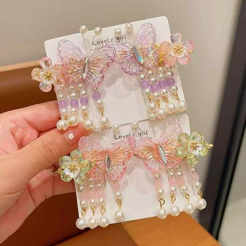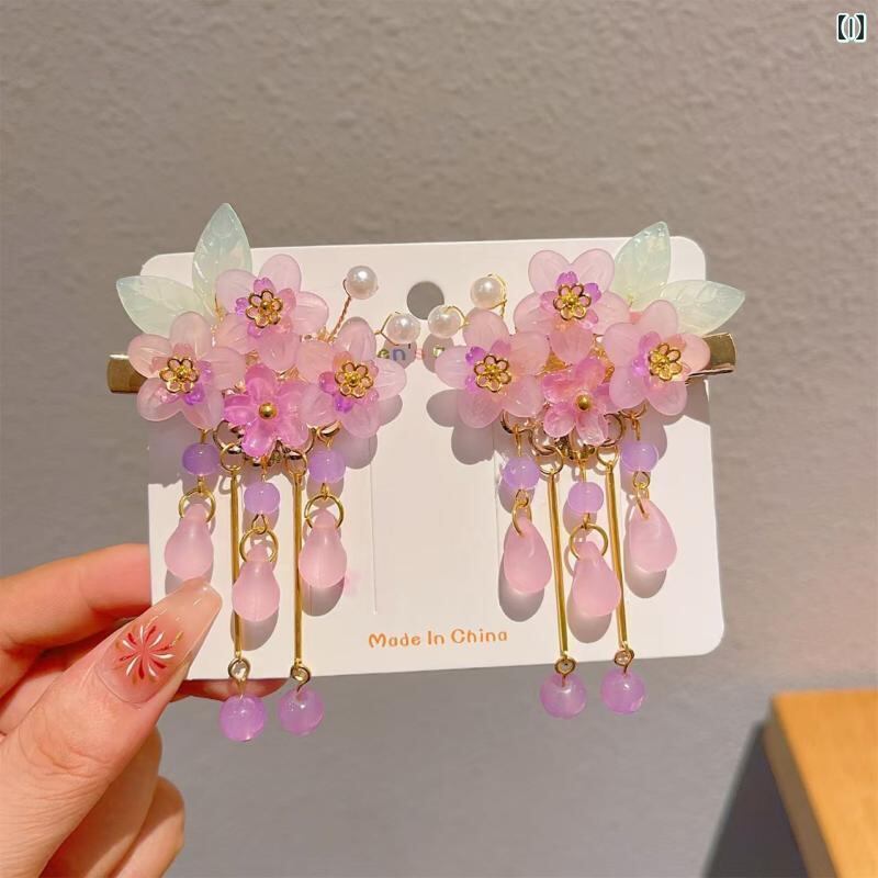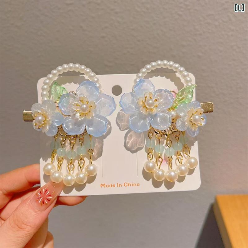 ヘアアクセサリー 女の子 キッズ 漢服 古風 レトロ 和装 花 パール タッセル 蝶々 立体装飾 金属製 ヘアクリップ 髪留め ワニ口クリップ 七五三 発表会 お祭り イベント 普段使い ピンク ブルー パープル