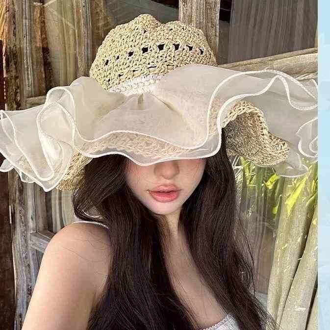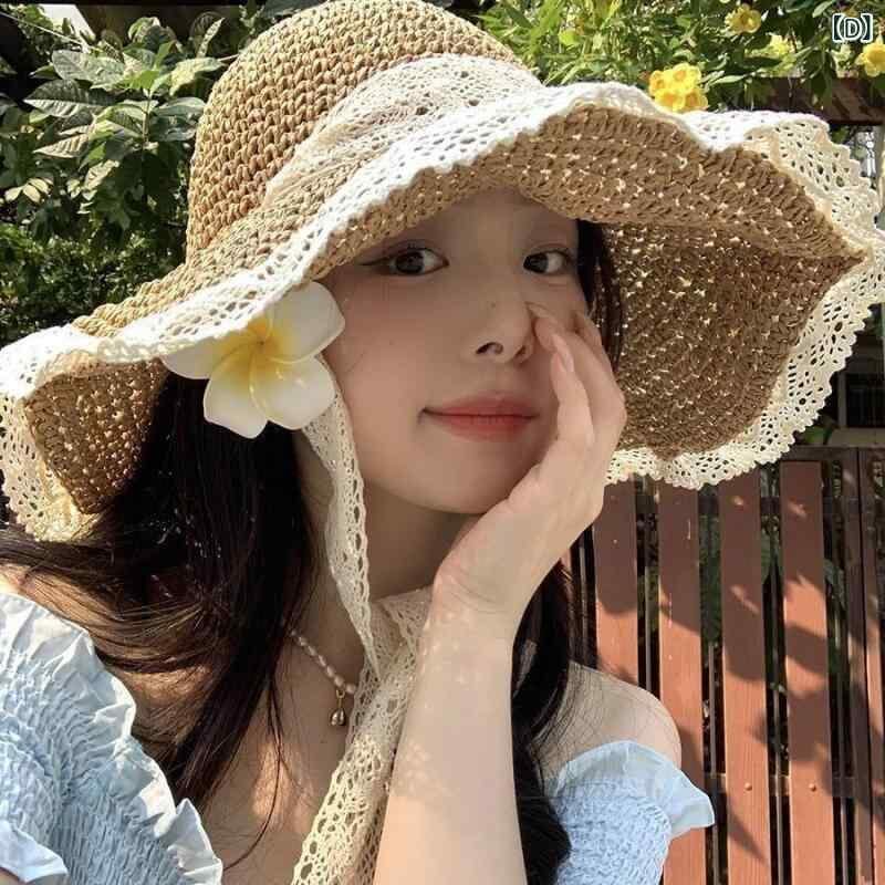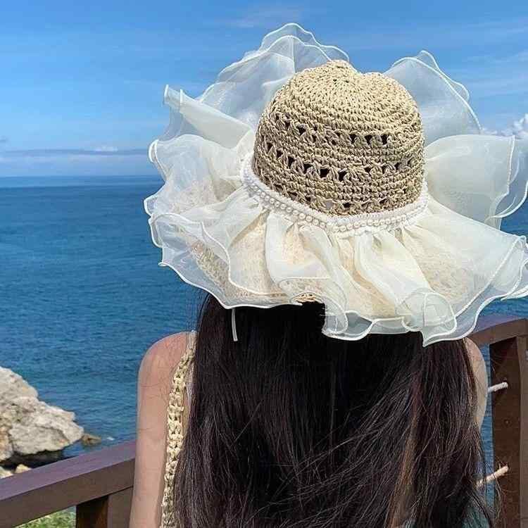 麦わら帽子 レディース ショール付き レース編み つば広 顔全体カバー UVカット 日よけ 通気性 夏用 ビーチ リゾート アウトドア 日焼け対策 フェミニン ナチュラル スイート リボン パールメッシュ ベージュ カーキ ブラック オフホワイト
