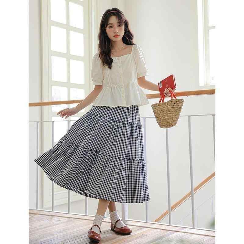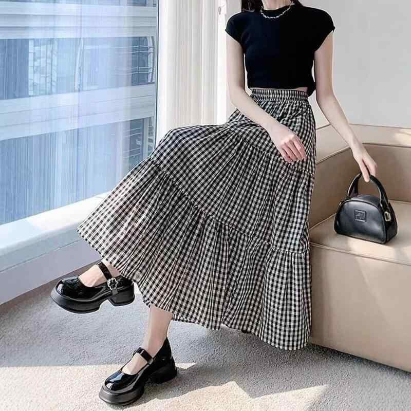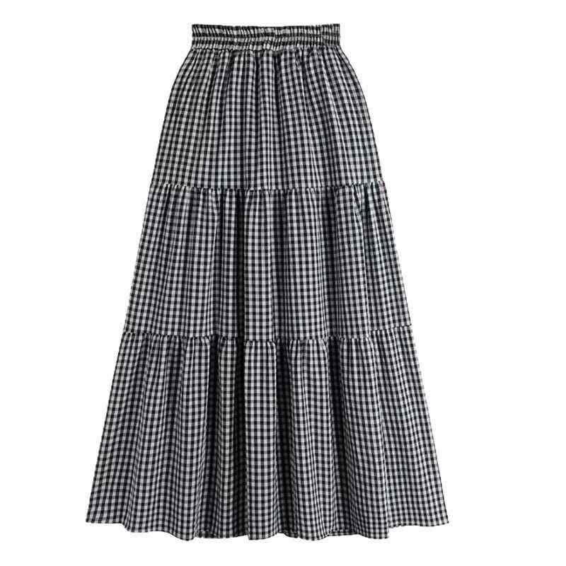 スカート レディース レトロ 小格子柄 ハイウエスト Aライン ロングスカート 体型カバー フレア ブラック 再生繊維 ミモレ丈 ポケット付き
