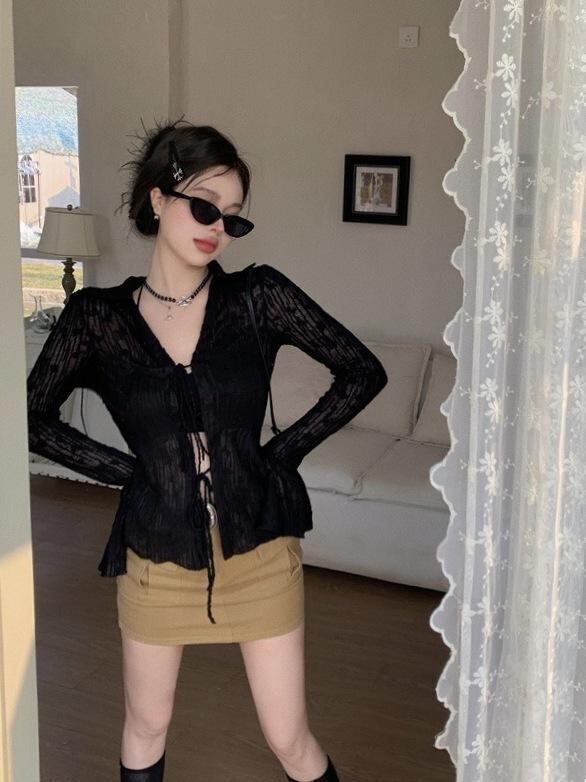 カーディガン レディース シフォン ブラウス ウエストリボン ウエストマーク シアー スリムフィット 長袖 きれいめ 大人カジュアル 無地 ポリエステル アプリコット 黒