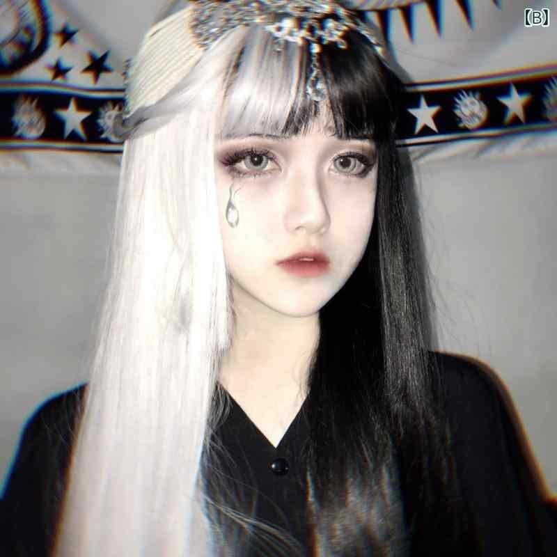 コスプレウィッグ 男女兼用 姫カット ロングストレート 黒白ツートン ボリューム 高温耐熱ファイバー ロリータ系 ファッション イベント 仮装 撮影用 フルウィッグ