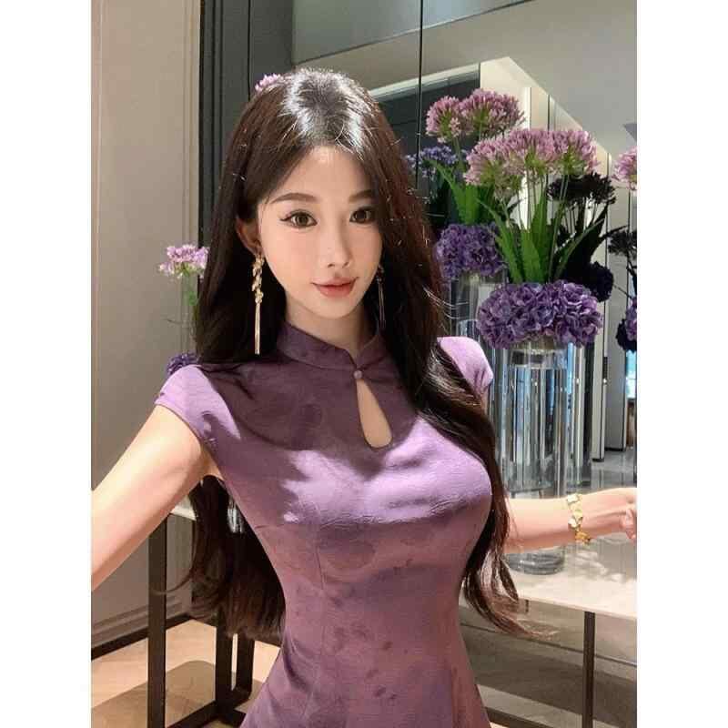 ワンピース 肌映えパープル 新チャイナ風 高級感 エレガント 改良型 花柄 半袖 ロング丈 Aライン チャイナドレス お呼ばれ フォーマル 上品