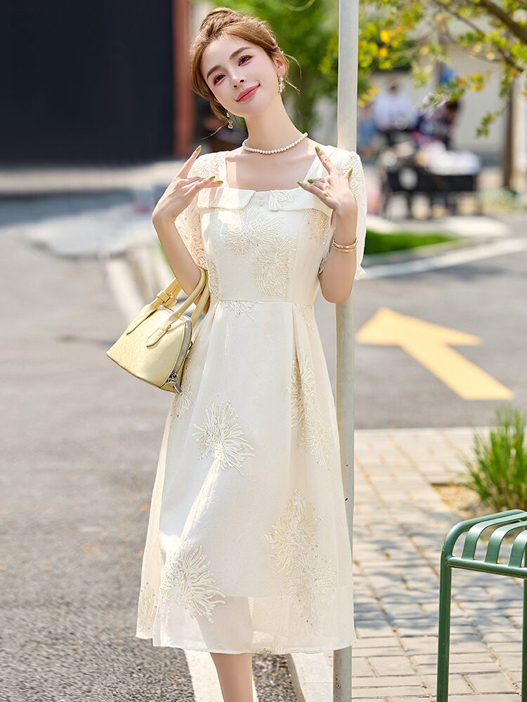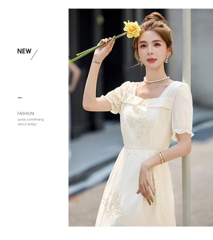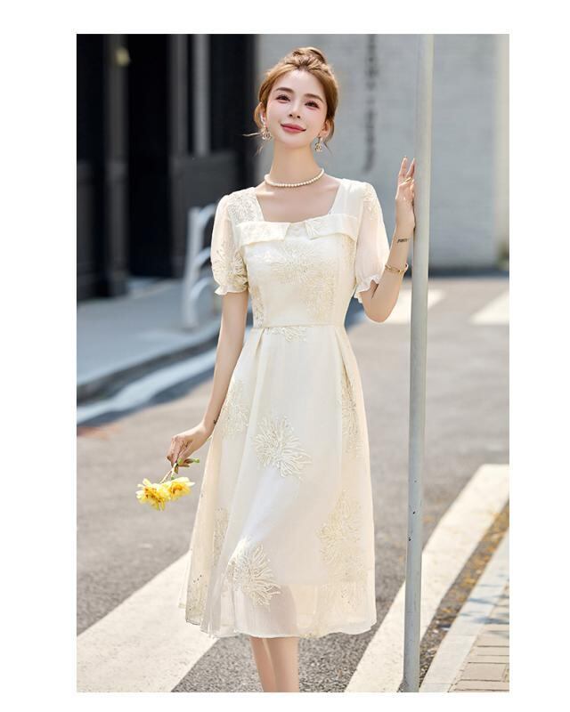 ワンピース レディース 半袖 新チャイナ風 中華風 小柄 低身長向け スクエアネック ミモレ丈 Aライン 刺繍 ポリエステル 小花柄 ギャザー プルオーバー エレガント 通勤スタイル