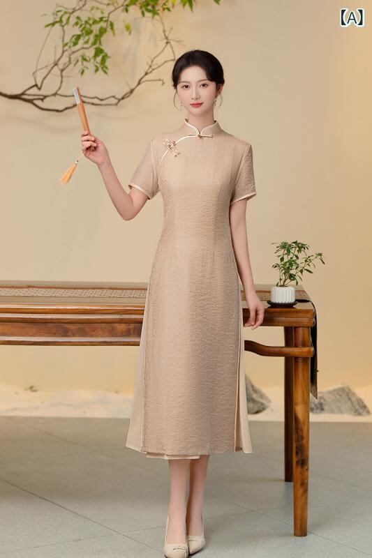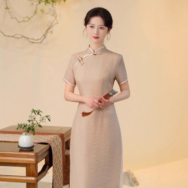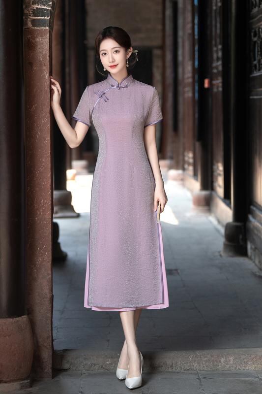 チャイナドレス レディース 改良型 ロング丈 新中華風 レトロモダン エレガント 光沢サテン 七分袖 半開襟 斜め襟 サイドスリット ベージュ ラベンダー フォーマル パーティードレス