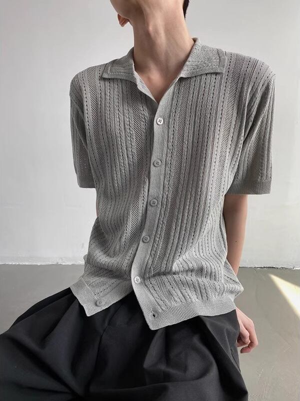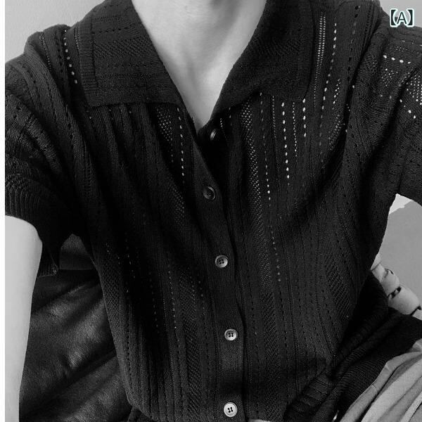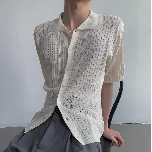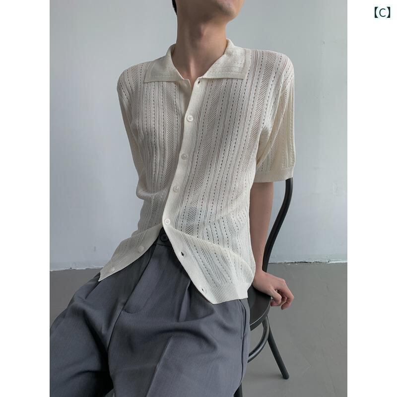 シャツ メンズ 半袖 アメリカンレトロ 透かし編み ニット 開襟シャツ ルーズフィット メッシュ シアー ワークテイスト アウター 通気性 ポリエステル 無地 薄手 春夏秋 カジュアル