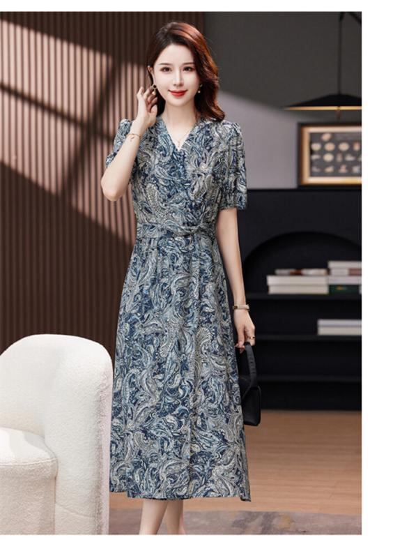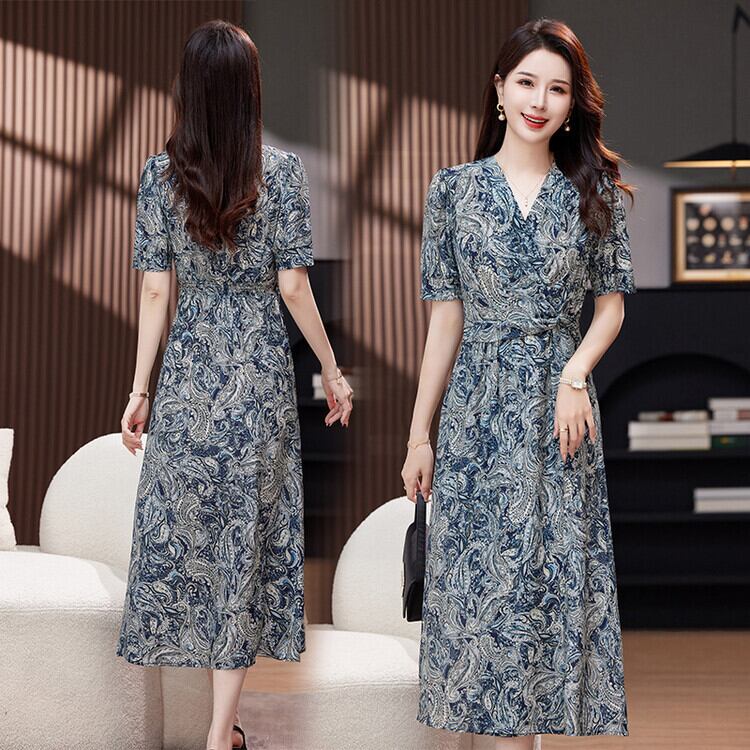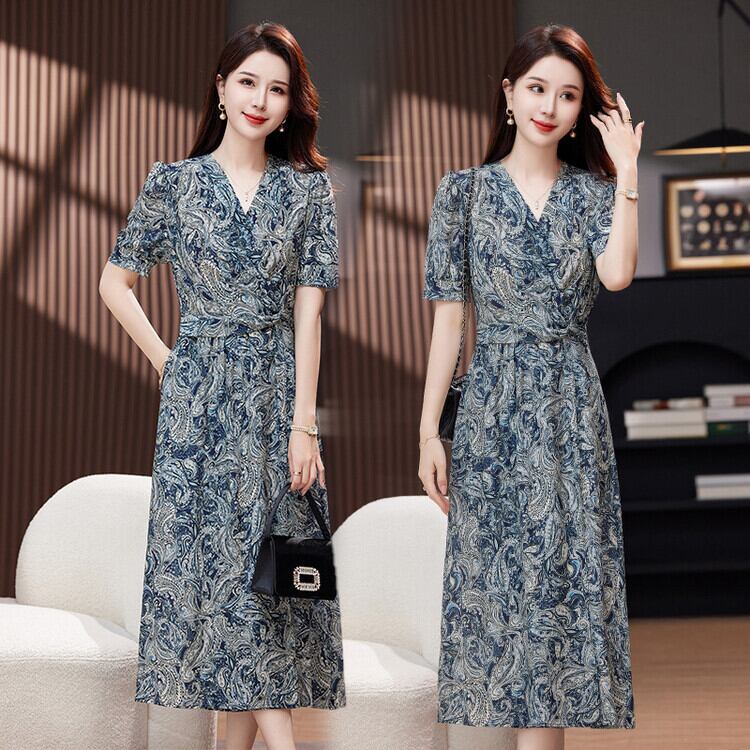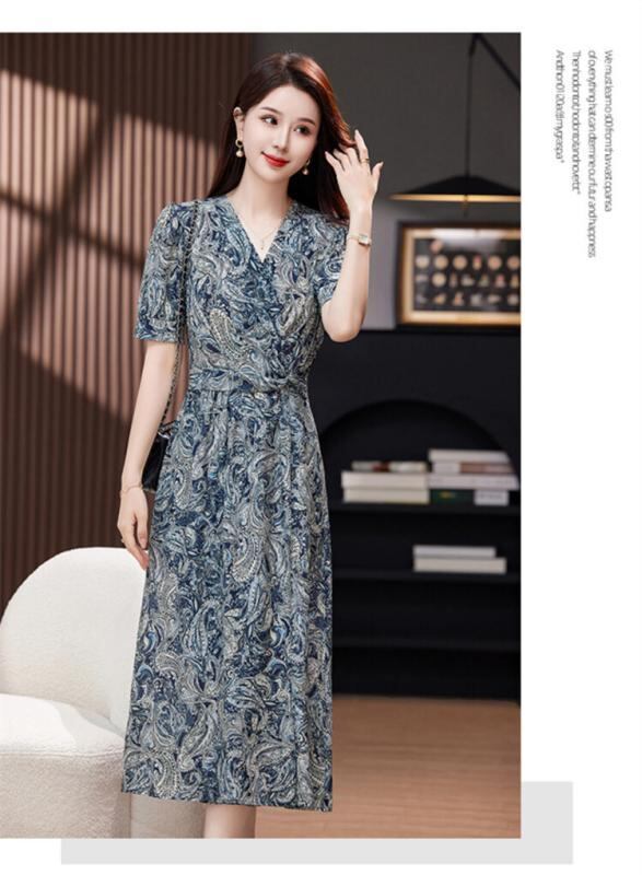 ワンピース レディース 夏 半袖 Vネック 小花柄 フラワープリント ミディ丈 ひざ下丈 ウエストシェイプ 細見え 着痩せ スタイルアップ レトロ ヴィンテージ 中国風 上品 エレガント ブルー系 青色