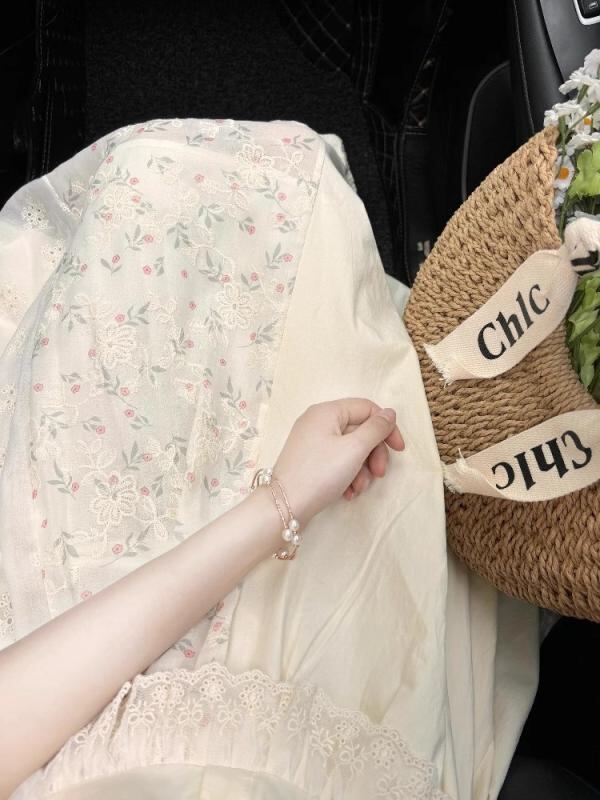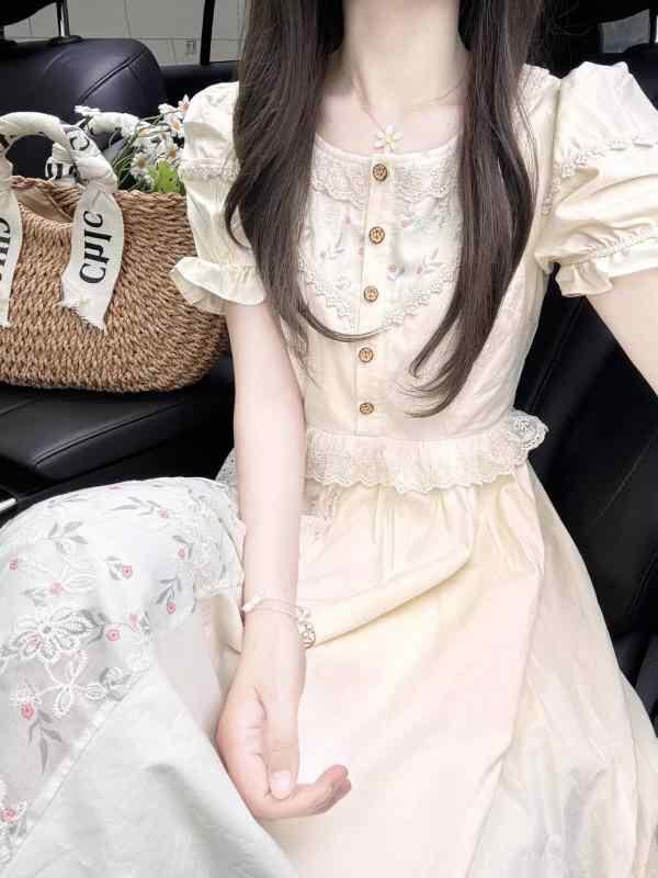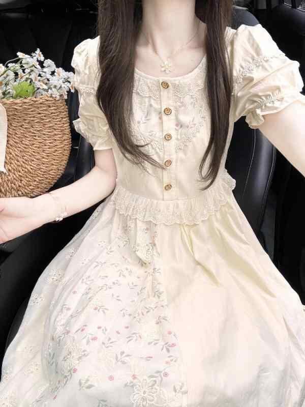 ワンピース レディース フレンチテイスト スイート 小花柄 夏 森ガール風 エレガント デザイン プリンセスライン レース ウエストマーク ロング丈 Aライン 半袖 ハイウエスト カジュアル ポリエステル