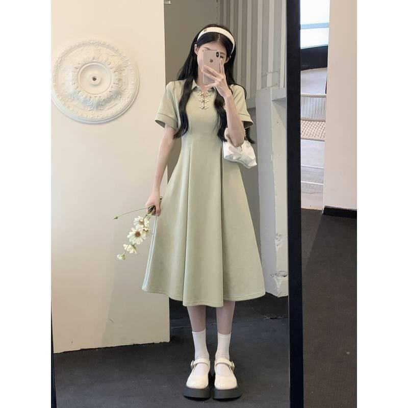 ワンピース 大きいサイズ レディース 改良チャイナドレス 新中式 モダンチャイニーズ 夏用 プリーツ Aライン ミディ丈 半袖 ポロ襟 チャイナボタン 体型カバー 細見え 上品 エレガント ポリエステル