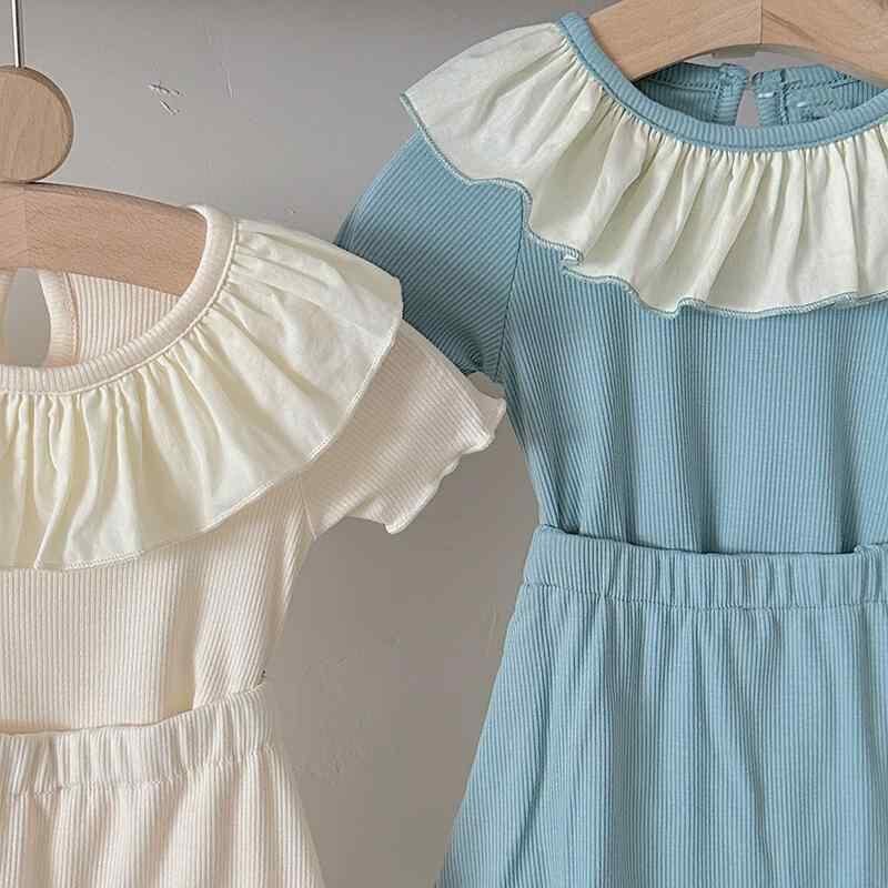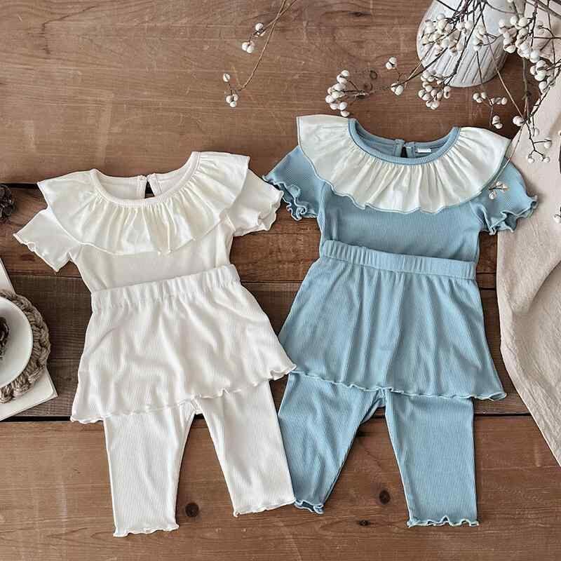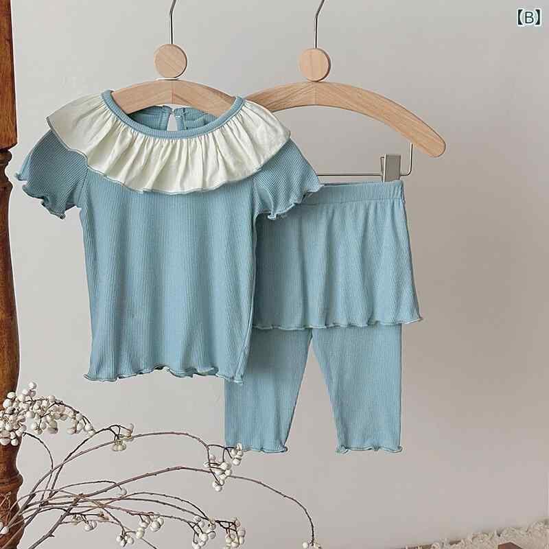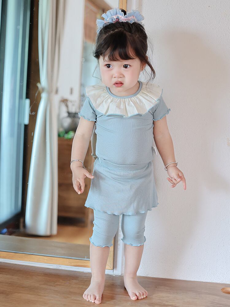 子供服 女の子 ベビー 半袖トップス スカッツ 上下セット 2点セット 夏服 薄手 綿 コットン 無地 フリル 七分丈パンツ やわらか 肌触り ソフト 軽量 キュート カジュアルスタイル