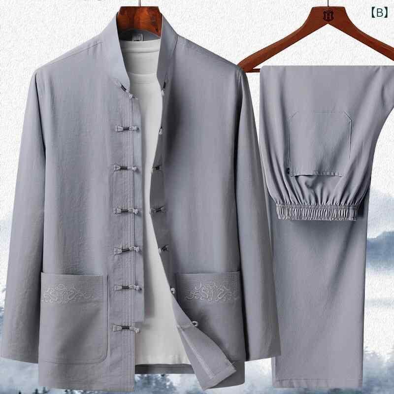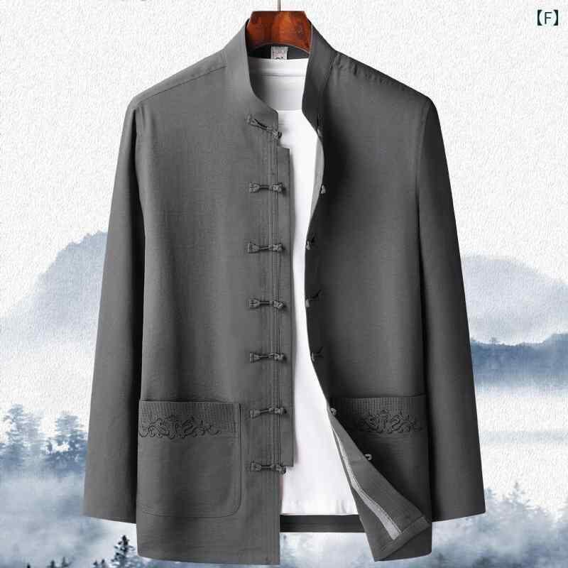 シャツ メンズ 中高年向け 長袖 新中華風 チャイナ服 太極拳服 春夏用 ポリエステル素材 刺繍入り 多機能ポケット 普段使い リラックスウェア グレー系 ネイビー カーキ アイボリー