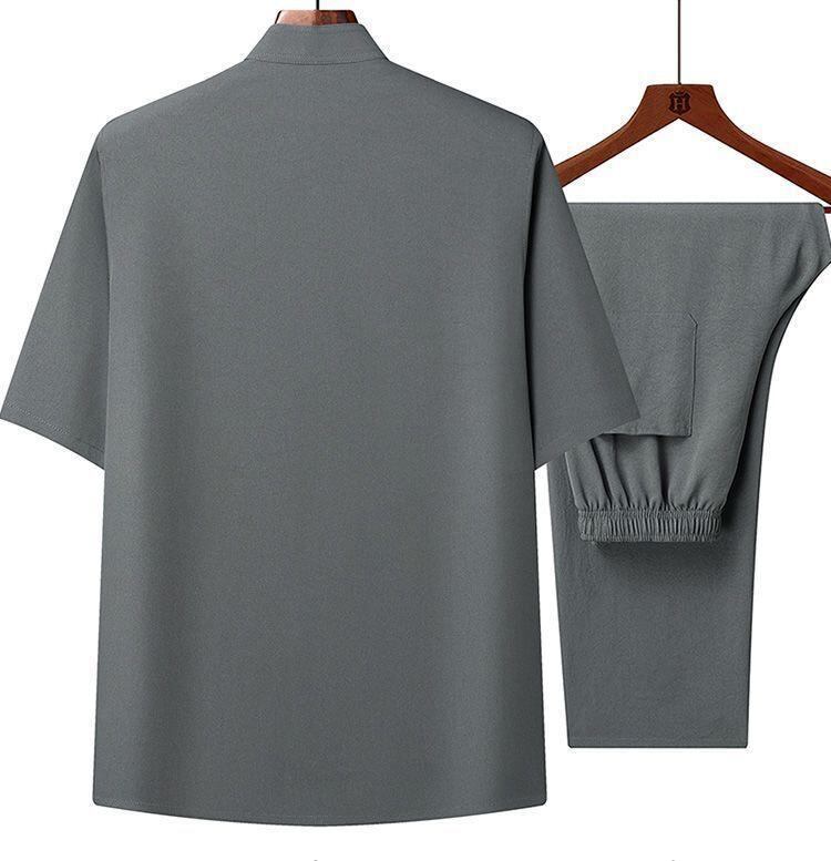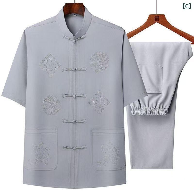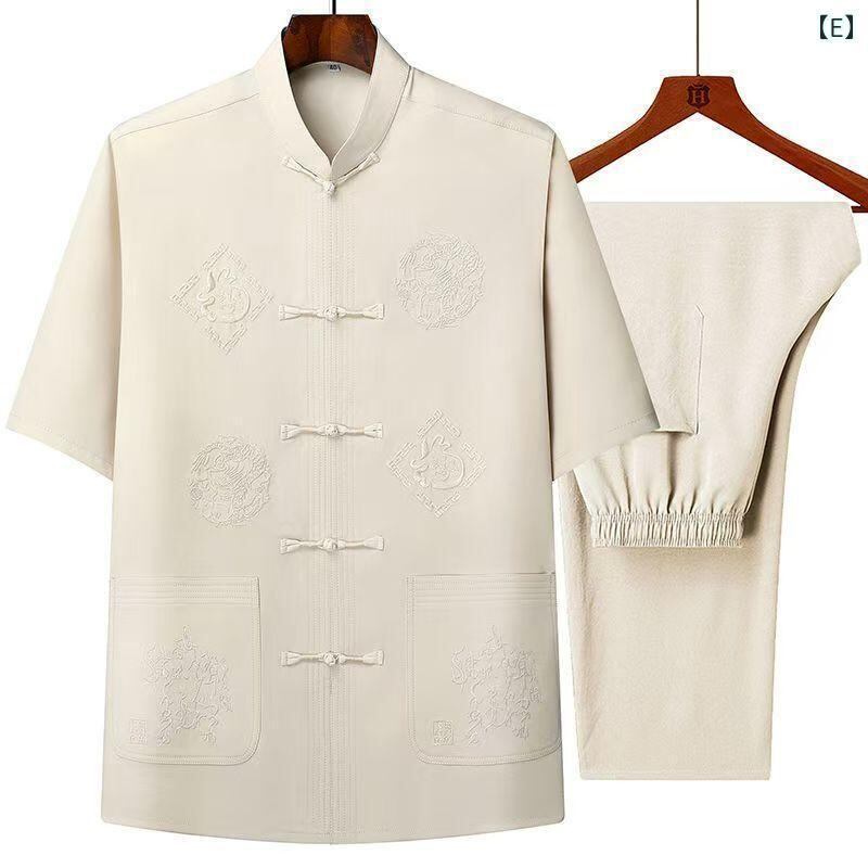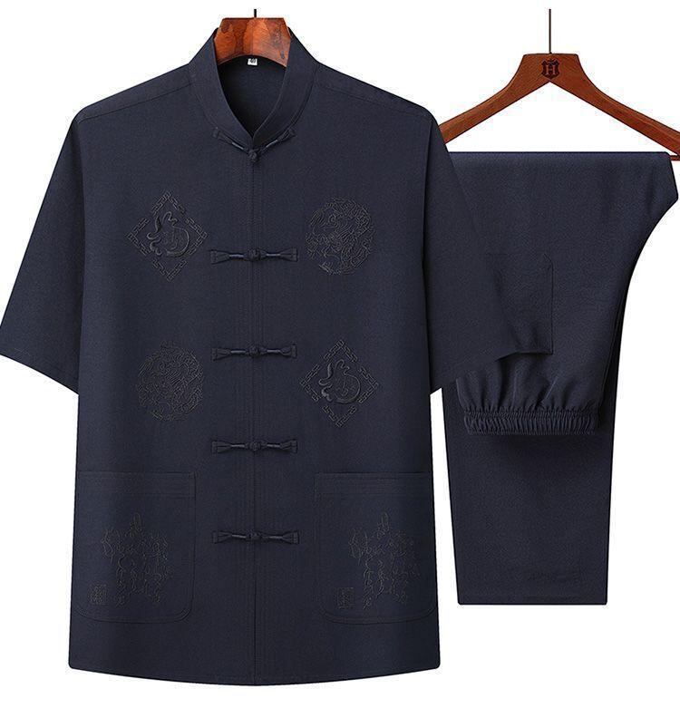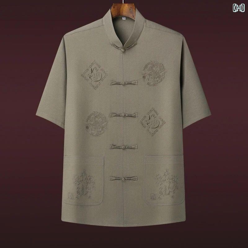 唐装 メンズ 中高年 シニア 半袖 夏物 夏用 中国風 民族風 福字 刺繍入り ポケット付き 無地 ポリエステル混紡 セットアップ 上下セット カジュアル 普段使い リラックスウェア
