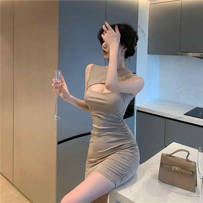 ワンピース レディース ノースリーブ ミニ丈 タイト ボディコン スリムフィット デコルテ開き ギャザー シャーリング 体型カバー ウエストシェイプ エレガント セクシー 無地 ポリエステル カジュアル ストリート
