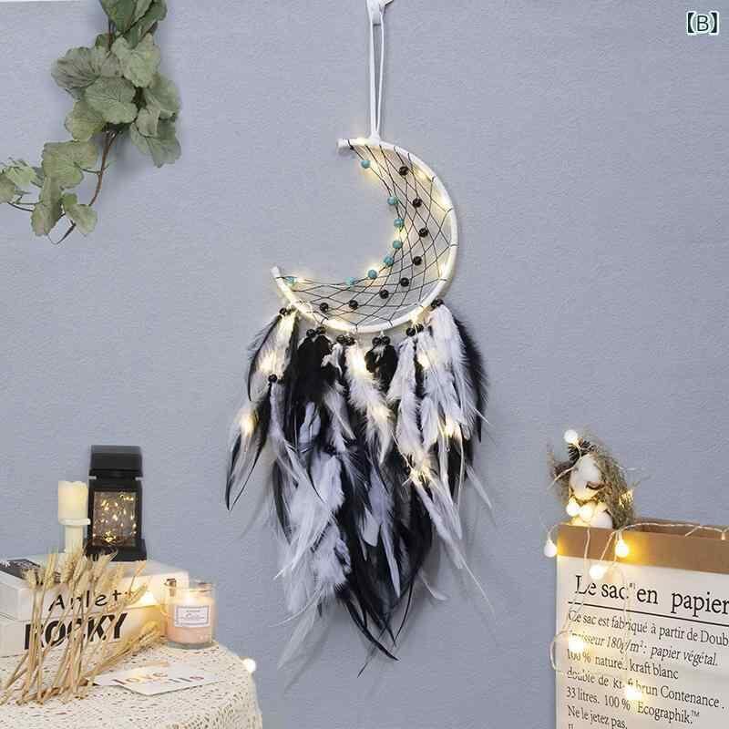 ドリームキャッチャー 女の子 手作り 月 羽根 壁掛け ムーンモチーフ LEDライト インテリア 飾り 寝室 子供部屋 ガールズルーム おしゃれ かわいい 幻想的 プレゼント 贈り物 お守り 癒し