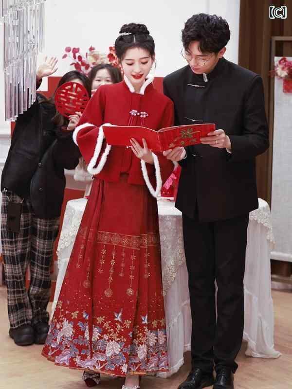 ドレス レディース 馬面スカート 中華風 ツーピース セットアップ 結婚式 披露宴 パーティードレス フォーマル ワインレッド ロング丈 厚手 秋冬 半袖 ポリエステル スパンデックス混紡