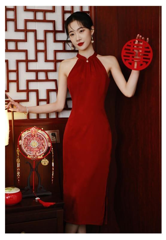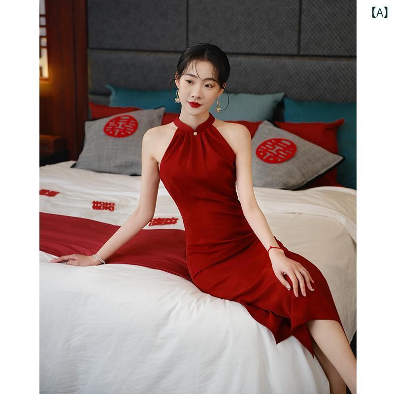 チャイナドレス レディース 改良デザイン 結婚式 披露宴 花嫁 ウェディング 婚約 パーティ 二次会 フォーマルドレス ワインレッド ロング丈 ノースリーブ ホルターネック ハイウエストスリット 中国風 ポリエステル