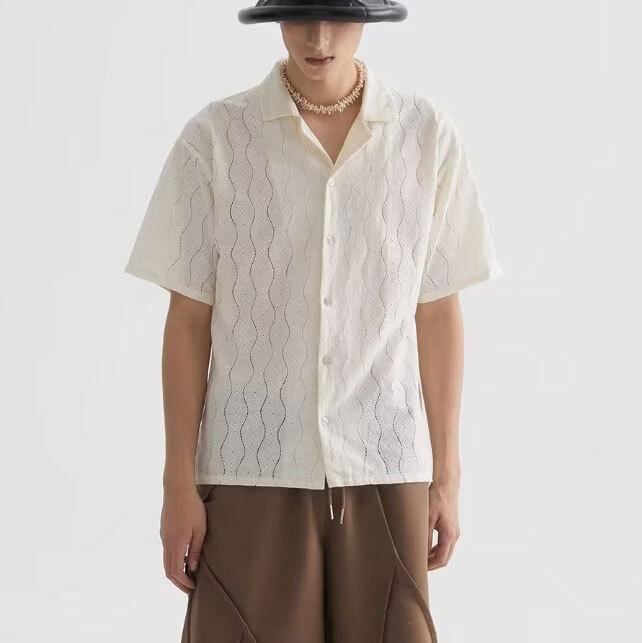 シャツ メンズ 透かし編み レース メッシュ シースルー 半袖 セクシー トップス スリムフィット 襟付き 綿混 通気性 アイボリー 個性派 ナイトスタイル カジュアル おしゃれ
