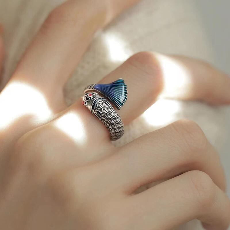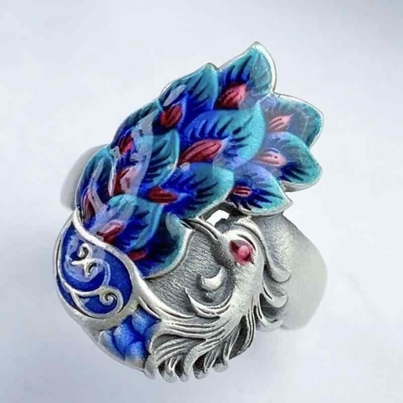 リング レディース 鳳凰 孔雀 七宝焼き 焼青 レトロ アンティーク加工 民族風 文芸風 オープンリング フリーサイズ 銅 シルバーメッキ レトロシルバー