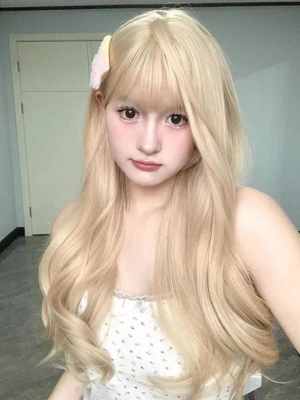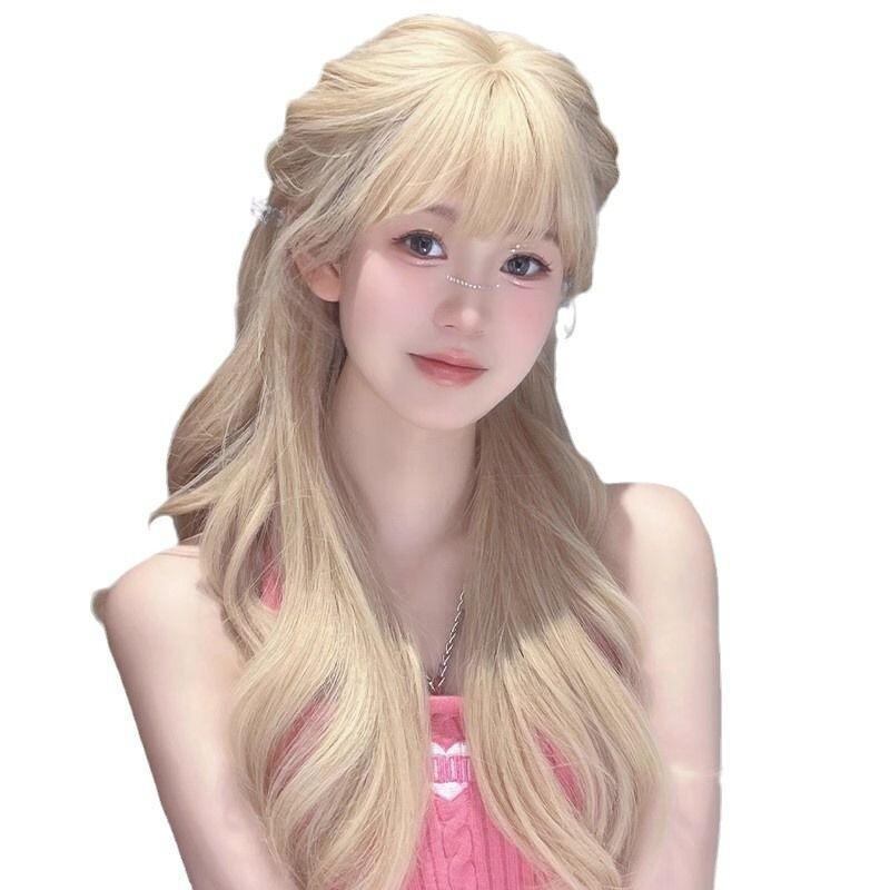 ウィッグ レディース プラチナブロンド ロングカール 大波巻き ぱっつん前髪 ロリータ 耐熱ファイバー フルウィッグ 印象チェンジ 自然な仕上がり 小顔効果
