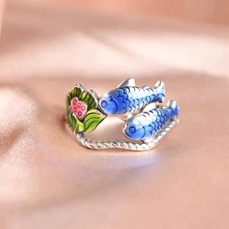 リング レディース 錦鯉 蓮の花 魚モチーフ ペアフィッシュ 動物モチーフ レトロ ヴィンテージ エナメル加工 透かし彫り オープンリング フリーサイズ サイズ調整可能 合金製 個性的 おしゃれ アクセサリー 指輪 カラフル