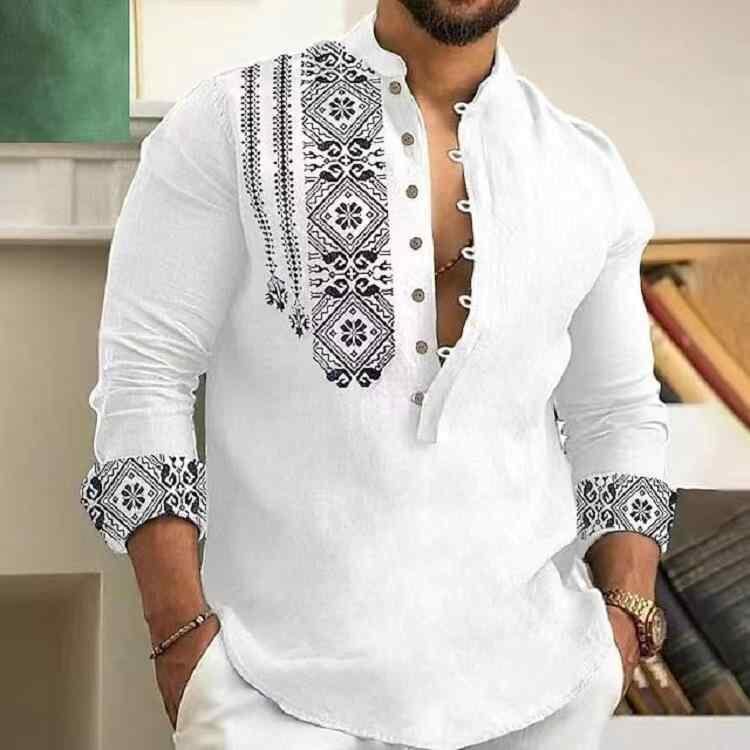 シャツ メンズ 長袖 スタンドカラー プルオーバー 薄手 カジュアル 綿混素材 防シワ加工 プリント柄 ビジネスカジュアル スリムフィット 夏用