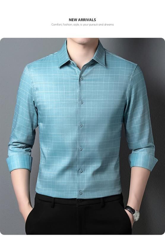 シャツ 男性用 高級感 チェック柄 長袖 ビジネス カジュアル ルーズフィット 春秋 通勤 オフィス デート 普段使い ポリエステル混紡 通気性抜群 洗濯機可 ノーアイロン 薄手 グリーン系 ブルー系 グレー系