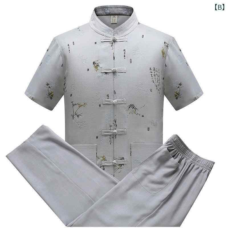 唐装 メンズ 男性用 中高年 夏物 半袖 セットアップ 中国風 太極拳ウェア カンフー服 麻調 ポリエステル混紡 通気性 涼感 カジュアル 普段使い