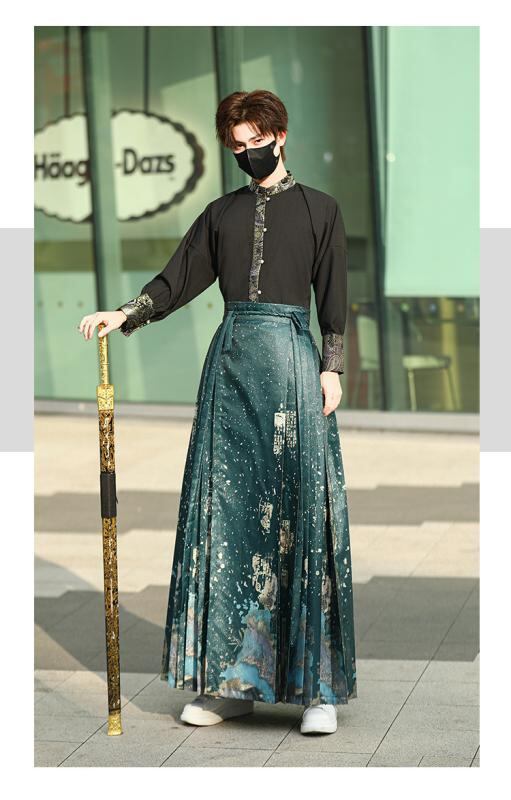 漢服 男女兼用 ユニセックス カップル ペアルック 箔押し グラデーション 古風 馬面スカート セットアップ 上下セット 綿素材 コットン 大きいサイズ ビッグシルエット ゆったり ブラック ブルー | cybercart