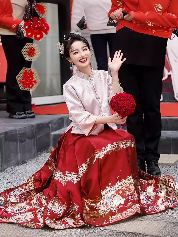 ドレス レディース 新中式 馬面裙 セットアップ 婚礼 敬酒服 お色直し 結婚式 披露宴 二次会 パーティー 礼装 Aライン ロング丈 ハイウエスト 長袖 ワインレッド ボルドー