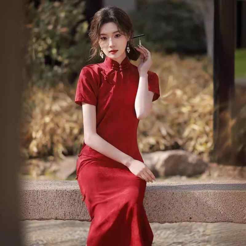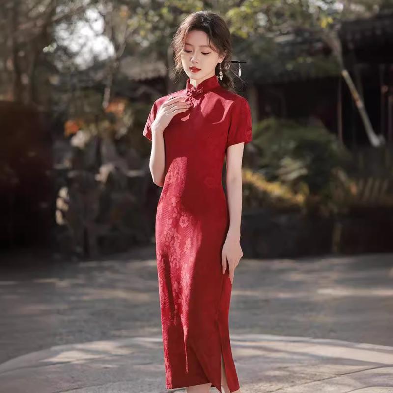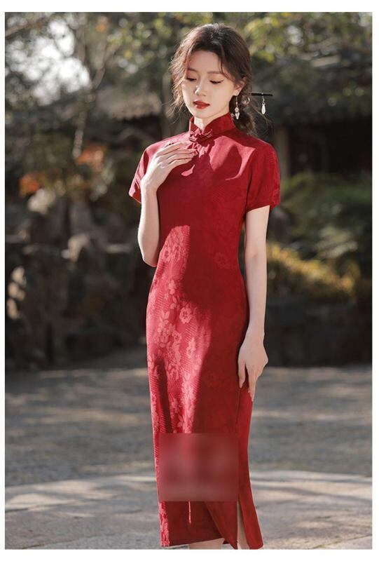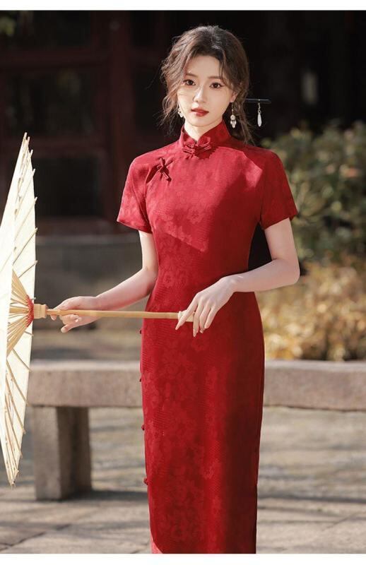 ワンピース レディース 中国風 レトロ 改良チャイナドレス レッド ロング丈 披露宴ドレス フォーマルドレス 高級感 ポリエステル 婚約パーティー スリット入り フレンチスタイル セレブ スタンドカラー 短め袖 お呼ばれドレス 二次会ドレス