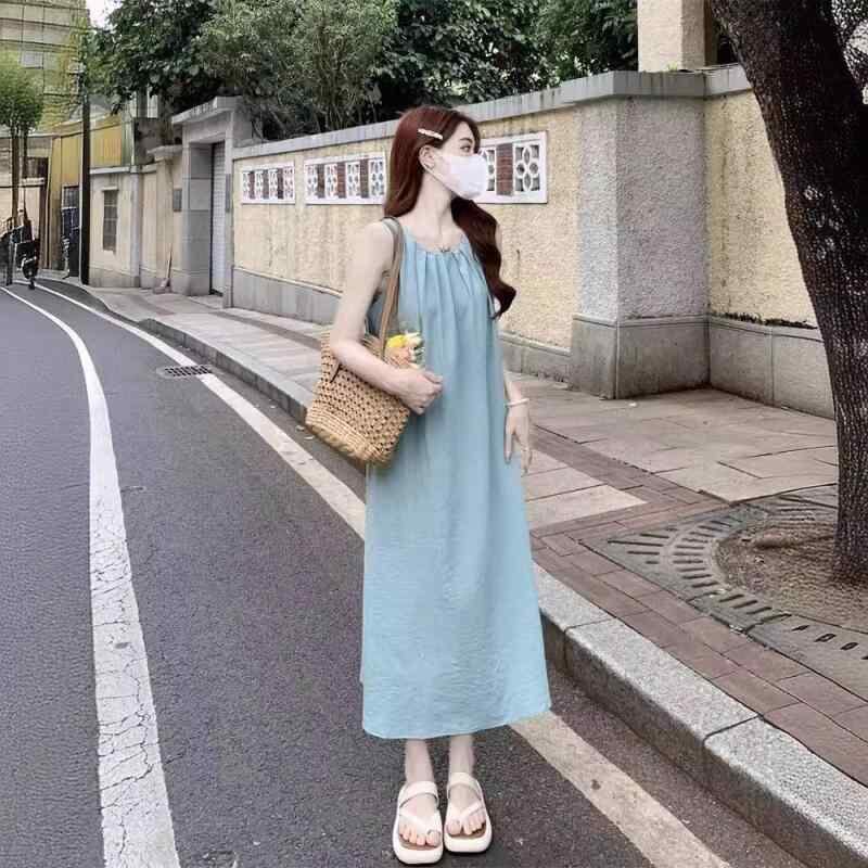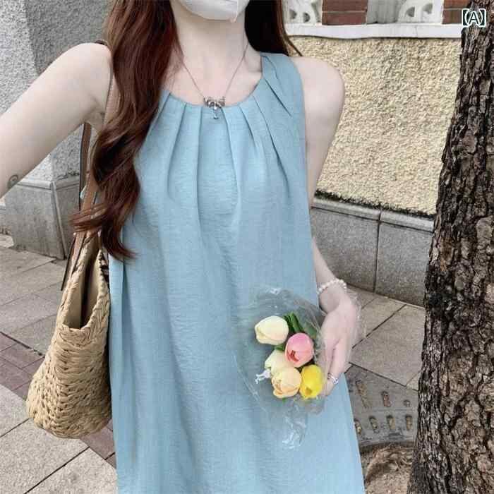 ワンピース レディース ロング丈 マキシ丈 ノースリーブ キャミソール リゾート ビーチ バカンス 夏 サマー ゆったり ルーズフィット 体型カバー 着痩せ 大きいサイズ ラウンドネック プリーツ ポリエステル Aライン カジュアル フェミニン