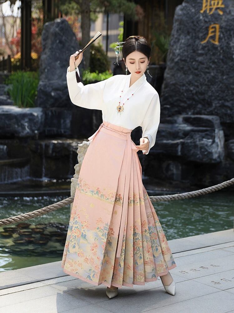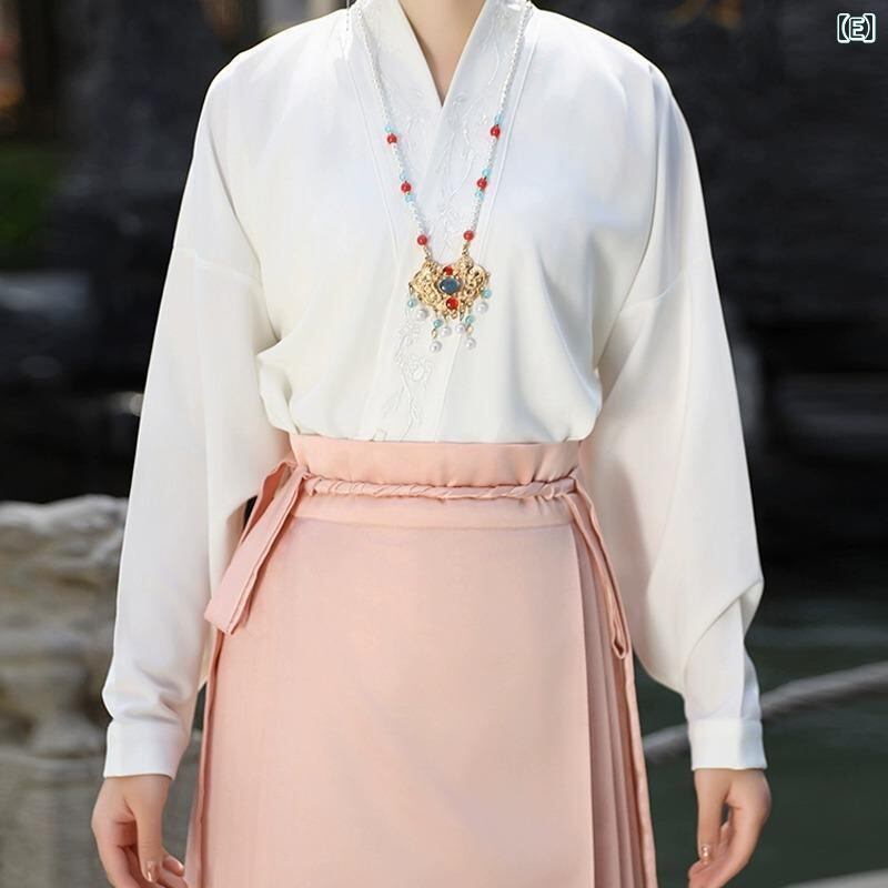 漢服スカート レディース 明代風 改良デザイン 中華風 通勤 日常使い 低身長向け ポリエステル 金糸織り 刺繡 光沢 セットアップ 上下セット