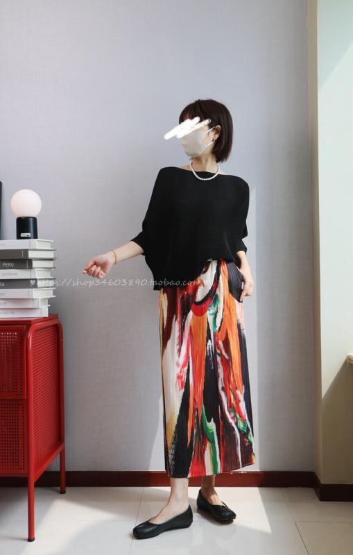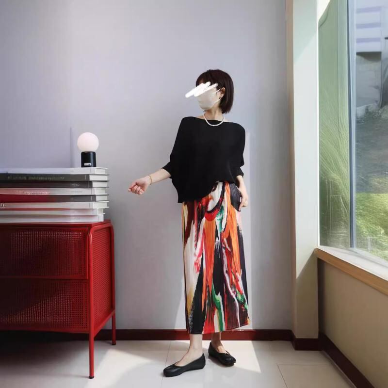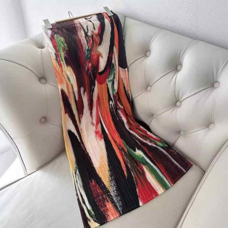 スカート レディース ヴィンテージ調 レトロ 幻想的な 虹色 瑠璃色プリント 縦縞 プリーツ ストレート ミモレ丈 ポリエステル ストレッチ 上品 大人カジュアル