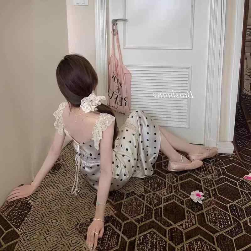ワンピース レディース ドット柄 レース キャミソールワンピース ロング丈 バックオープン ウエストマーク 細見え 上品 フェミニン スクエアネック ハイウエスト ポリエステル アプリコットカラー リゾート