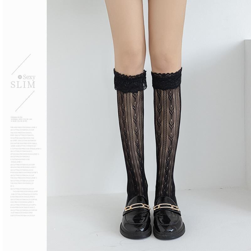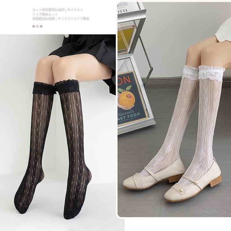 靴下 レディース セクシー レース 網タイツ JK ロリータ スタイル 薄手 ひざ下丈 シースルー 透け感 甘め 花柄 フリル ポリエステル製 ミドル丈 黒 白