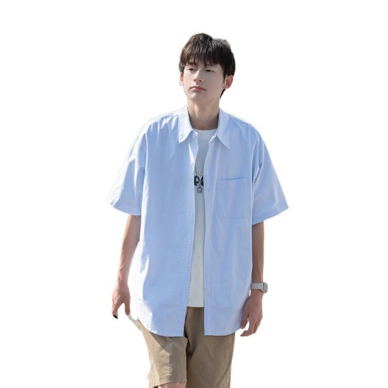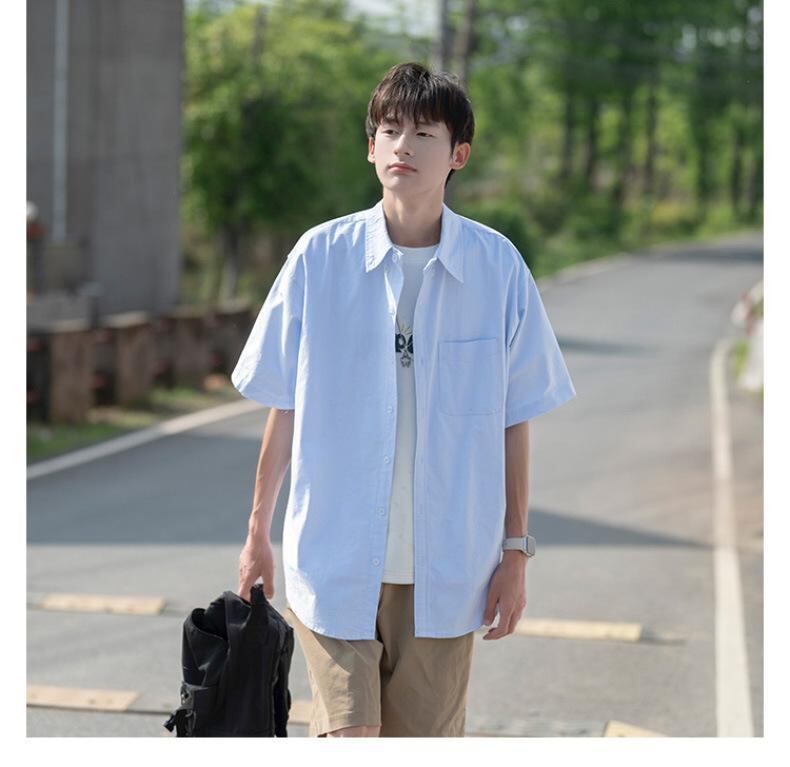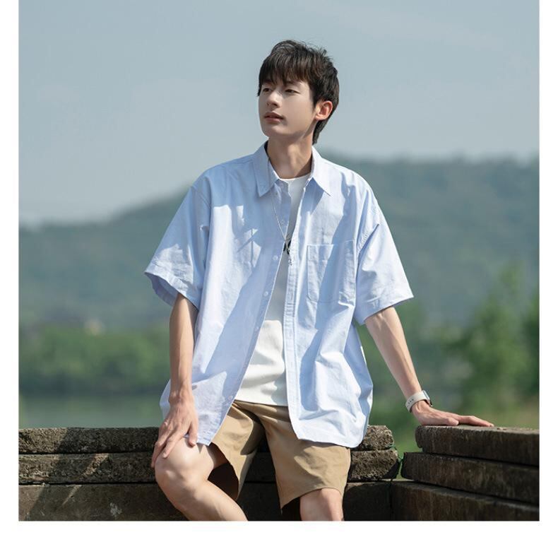 開襟シャツ メンズ 半袖 ゆったり 麻混紡 ストレッチ素材 ライトブルー カジュアル 夏服 普段使い リゾート 旅行 ティーン 学生向け 通気性 快適