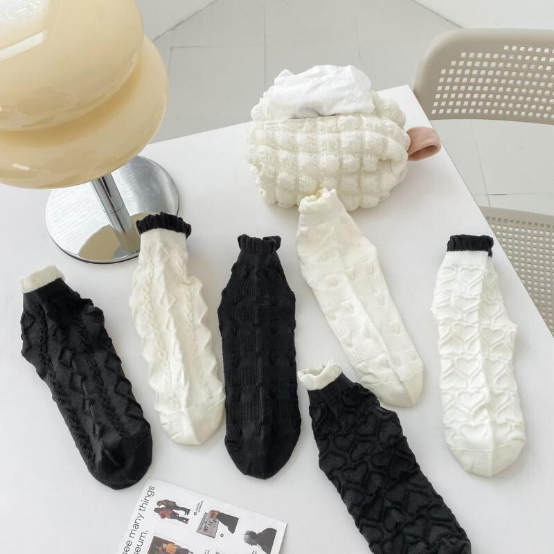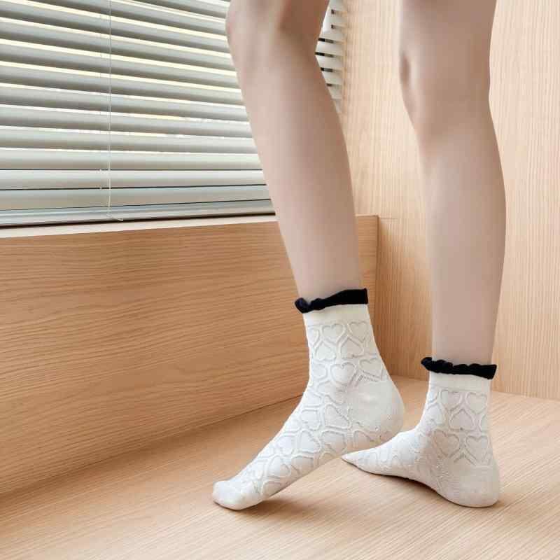 靴下 レディース JK風 ロリータ プリンセス メロウフリル レース ミドル丈 コットン 滑り止め 摩擦防止 普段使い カジュアル 白黒 ハート柄 菱形 幾何学柄 オールシーズン